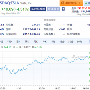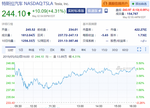 新浪科技讯 北京时间5月3日凌晨消息,特斯拉周四股价逆势上涨,截至收盘,特斯拉报244.10美元,涨幅达4.31%,市值达422.27亿美元。