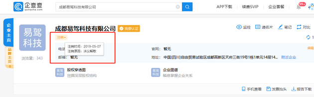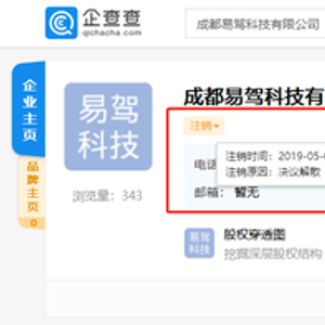 新浪科技讯 5月10日上午消息,企查查数据显示,5月7日,乐视汽车旗下成都易驾科技有限公司显示为注销状态,注销原因为“决议解散”。