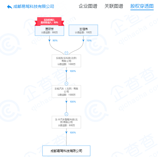 成都易驾科技有限公司成立于2015年12月,大股东为乐卡汽车智能科技(北京)有限公司,持股比例100%;而乐卡汽车智能科技(北京)有限公司为乐视汽车(北京)有限公司全资子公司,乐视汽车(北京)有限公司又是乐视致乐科技(北京)有限公司的全资子公司。