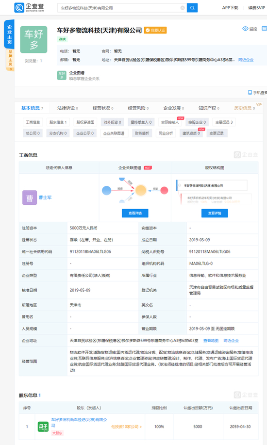 公开数据显示,法定代表人为曹士军,由车好多旧机动车经纪(北京)有限公司100%控股,经营范围包括:物流软件开发;道路货物运输;国内货运代理;物流分拨、配货;物流信息咨询;仓储服务;交通运输咨询服务;增值电信业务等业务。