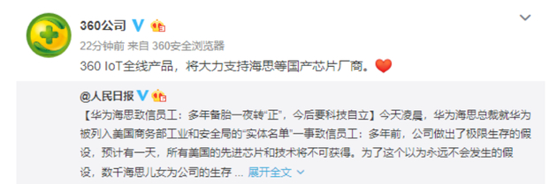 今日,《华为海思致信员工:多年备胎一夜转“正”,今后要科技自立》一文刷屏。360表示,将全力支持国产芯片厂商,携手打造国产科技全产业生态链。目前,360旗下多款IoT智能硬件产品已经与海思展开合作,产品包括AI摄像机和家庭安全大脑等。
