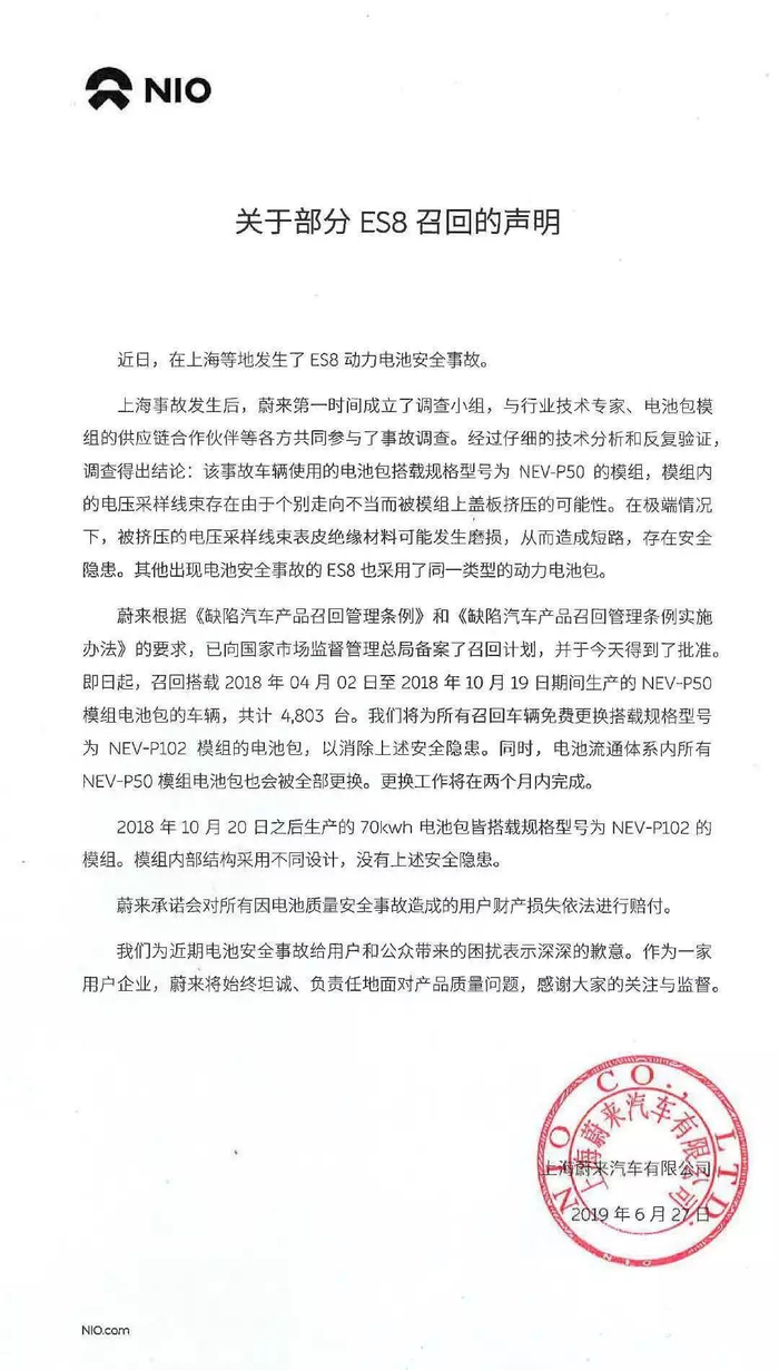 根据蔚来汽车的公告,此次召回的车辆主要是“搭载了2018年4月2日到2018年10月19日期间生产的动力电池包,动力电池包采用了规格型号为NEV-P50的模组。”