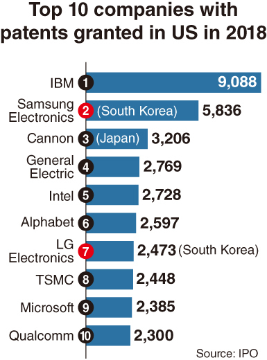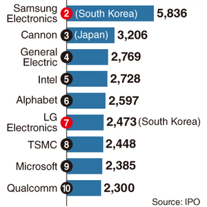 日本和中国台湾各有一家公司挤进前十:日本的佳能排名第三,台积电排名第八。