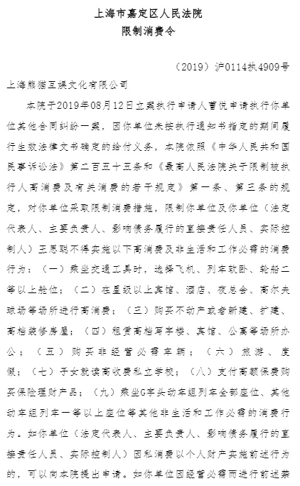 文件显示,上海市嘉定区人民法院于2019年8月12日立案执行申请人曹悦申请执行上海熊猫互娱文化有限公司其他合同纠纷一案,因熊猫互娱未按执行通知书指定的期间履行生效法律文书确定的给付义务,被采取限制消费措施,限制其法定代表人、主要负责人、影响债务履行的直接责任人员、实际控制人王思聪不得实施高消费及非生活和工作必需的消费行为。