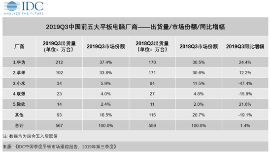 可根据市场调研机构 IDC 的最新数据,在消费市场,2019 年第三季度,平板电脑的出货量同比增长了 9.1%。同时华为在这一季度首次登上了市场出货量的第一名,其市场份额达到了 37.4%。
