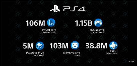 索尼官方表示,目前索尼PlayStation 4主机的出货量已经达到1.06亿台,索尼PlayStation 4游戏共售出11.5亿个,索尼PlayStation VR设备出货量为500万台。此外目前月活用户达到了1.03亿,PS Plus用户达到了3880万。