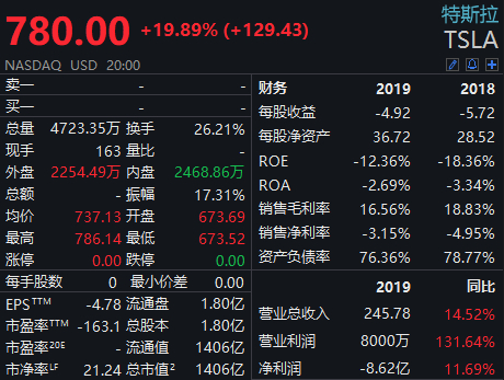 而美股市场上,特斯拉股价周一再度暴涨近20%,创下2013年以来的最大单日涨幅,收报780美元,总市值达到1406亿美元再创历史新高。今年以来,特斯拉的股价已经累计上涨86.46%。