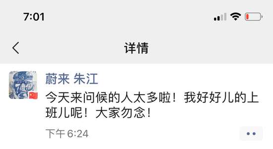 蔚来汽车副总裁朱江回应离职:好好上班呢,大家勿念
