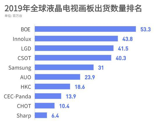 值得注意的是,CHOT后来者居上,甚至超过了夏普,面板出货量位列全球第九。