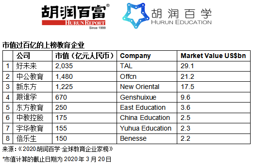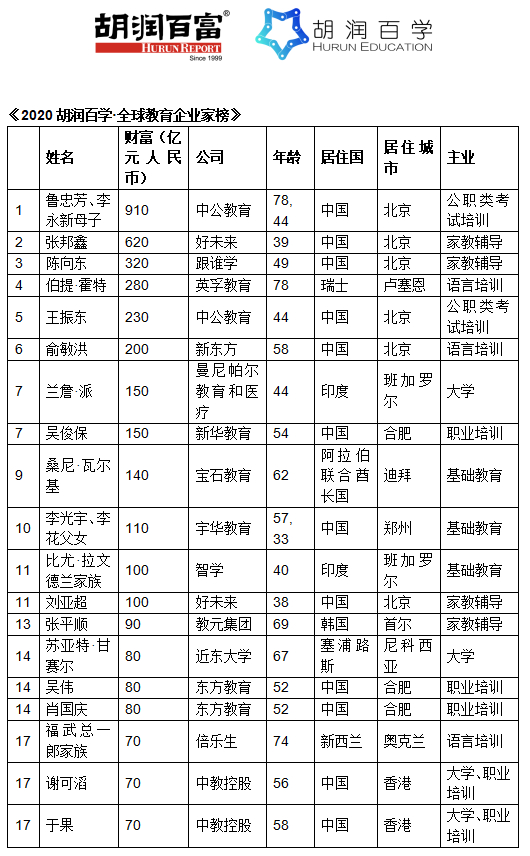 (2020年3月26日,上海)胡润研究院联合国际教育平台胡润百学发布《2020胡润百学·全球教育企业家榜》(Hurun Global Education Rich List 2020)。榜单统计了全球教育领域财富达十亿美金的企业家,以企业主业在教育领域为标准,财富计算的截止日期为2020年3月20日。