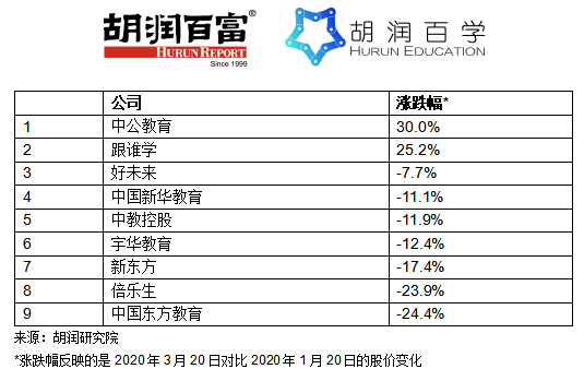 中公教育和跟谁学是近两月新冠疫情期间股价上涨最快的教育企业,分别上涨了30%和25%。相比之下,上证指数近两月下跌了11%。