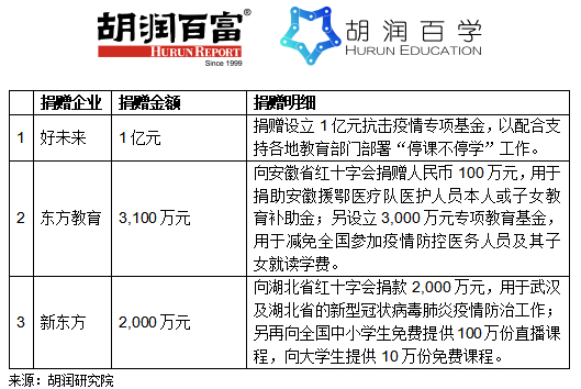 3家教育企业在新冠肺炎疫情中合计捐赠1.5亿元,其中好未来捐赠1亿元;