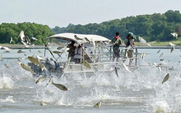 让美国人更头疼的是银鲤(白鲢)。这种鱼生活在水体上层,很容易被惊扰,听到船只马达声会突然跃出水面,甚至可以腾空1.8米。鲢鱼只需要3-4年就成熟,重量可以达到50斤。体型巨大的它们不仅会一头砸进船内,搞脏船舱吓到游客,还会损害船只马达,成为了当地渔业和旅游业的噩梦。