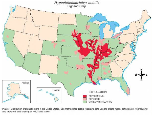 这些亚洲鲤鱼(四大家鱼)凭借强大的生命力和弹跳力,不仅一举冲出了运河和养鱼场,在几十年的时间里,从南部的墨西哥湾到北部的明尼苏达州,遍布美国密西西比河流域的大小河流湖泊,轻松秒杀了美国的原有鱼类,给美国水域生态带来了难以预料的危害。如上图所示,红色区域是亚洲鲤鱼泛滥地区,淡红色是已经出现亚洲鲤鱼的地区,绿色是有记录地区。