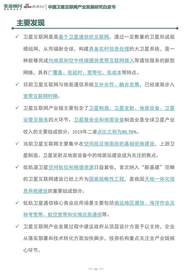 新浪科技讯 5月29日下午消息,赛迪顾问物联网产业研究中心与新浪5G联合发布《“新基建”之中国卫星互联网产业发展研究白皮书》(下简称“白皮书”)。白皮书共20页,阐述了卫星互联网产业的发展现状、战略意义、应用场景以及发展趋势等。