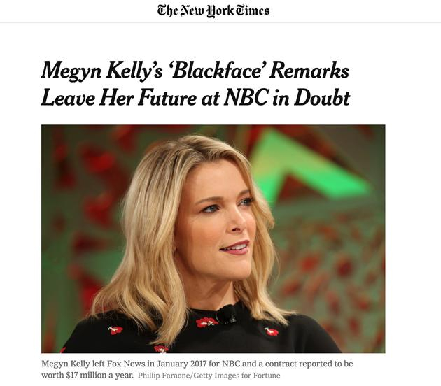 2018年底,前NBC明星主播梅根·凯利(Megyn Kelly)在谈话节目中公开表示“白人在万圣节抹个黑脸没什么大不了的”,而遭到NBC停播和解约的处罚。她原本是Fox电视台的当家花旦,因为和特朗普存在矛盾而在2017年跳槽到NBC;在被NBC解约之后,凯利现在做起了自媒体。