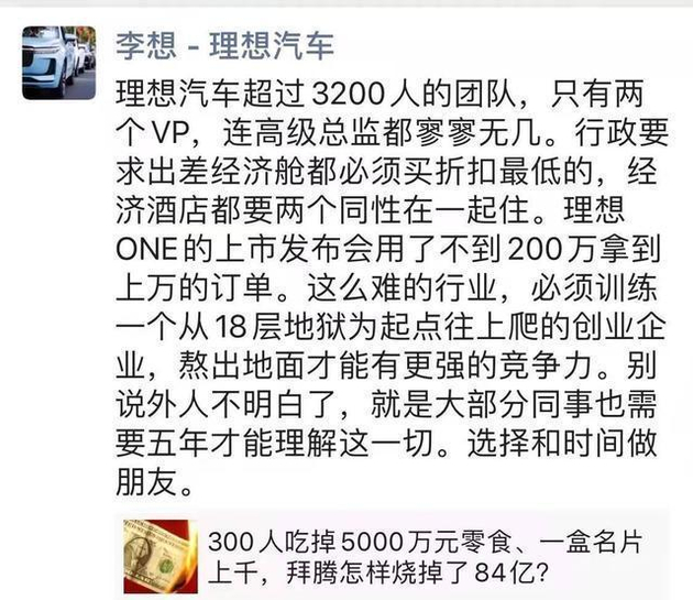 今年7月,李想如此评论拜腾的“奢侈”:“理想汽车超过3200人的团队,只有两个VP,连高级总监都寥寥无几。行政要求出差经济舱都必须买折扣最低的,经济酒店都要两个同性在一起住……”
