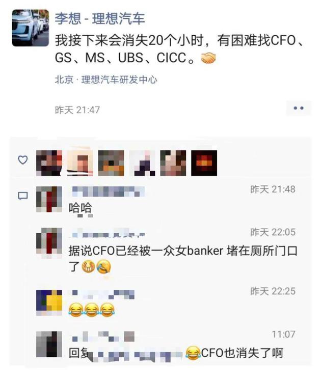 雪球上还流传着一张李想7月28日的朋友圈截图:“接下来会消失20小时,有困难找CFO、GS、MS、UBS、CICC。”底下有投资人留言称,CFO已经被一众人围堵在厕所门口。