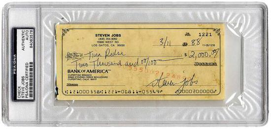 2018年,乔布斯的一张支票进入了拍卖会。这张2000美元的支票是乔布斯在1988年开给女性朋友瑞德斯(Tina Redse)的。在1989年遇到妻子劳伦娜(Laurene Powell Jobs)之前,乔布斯曾经和瑞德斯有过一段情缘。这张支票也透露出乔布斯很多个人信息,包括他的真名是STEVEN JOBS,而不是STEVE JOBS;当时他还住在硅谷南湾的Los Gatos。这座房子当时价值80多万美元,30多年后价值400多万美元。