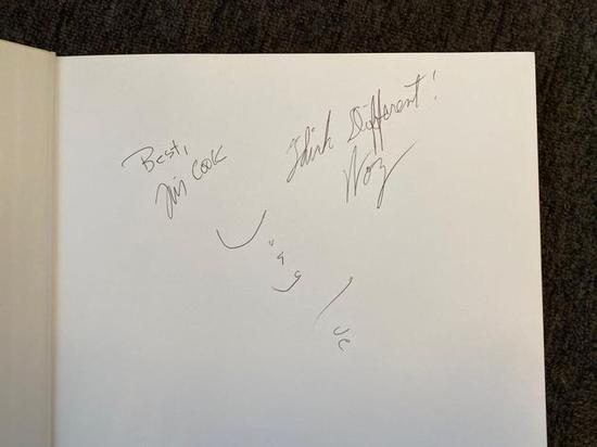 PS。说到苹果相关签名,我的北京同事郭老师2016年买了那本苹果设计圣经的大画册后,每次来硅谷参加活动都会背着这本重达10斤、价格300美元的超级大板砖;专门买了个登山包背着,肩膀还勒出了血印。直到第三年,才终于集齐了库克、沃兹尼亚克以及艾维的三人签名,圆了这个签名心愿。