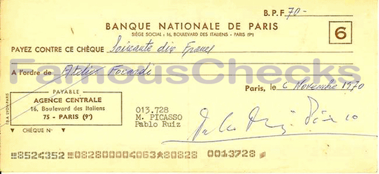在签名这件事上,西班牙知名画家毕加索就特别积极主动。毕加索习惯在杂货店购物时用小额支票付款,因为店员却舍不得兑现毕加索亲笔签名的支票,签名的价值远远超过了支票金额。这样毕加索等于免费购物,店员们也觉得物超所值,大家皆大欢喜。