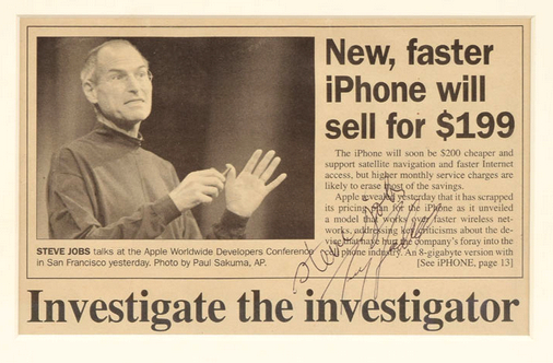2018年,乔布斯签名的一张报纸以2.7万美元的价格成交。这是2008年帕洛阿尔托一位女士在酸奶店偶遇乔布斯,顺手拿起一份报纸,翻到关于iPhone的报道,要求后者签名。尽管乔布斯再三婉拒,但还是挡不住女士软磨硬泡,他自己签完名之后还让身边的一个男士也签名。后来这位女士才知道,那位签名的男士是苹果负责iPod业务的高级副总裁法戴尔(Tony Fadell)。