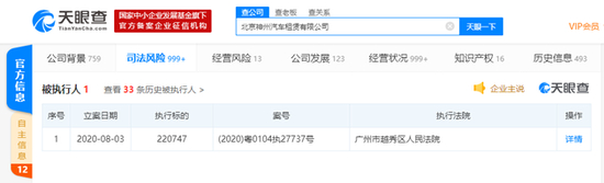 新浪科技讯 8月4日下午消息,中国执行信息公开网显示,8月3日,北京神州汽车租赁有限公司被广州市越秀区人民法院列为被执行人,案号为(2020)粤0104执27737号,执行标的220747。