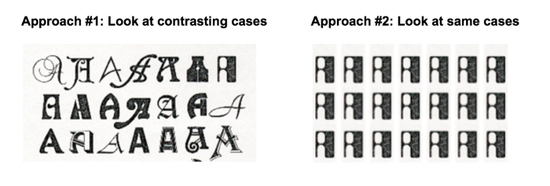 假设你想了解字母 “A”,并了解更深层次的原理:是什么让 “A ”成为一个A。那么你可以这么来做:方法一:看不同类型的 A ;方法二:看大量同样类型的 A