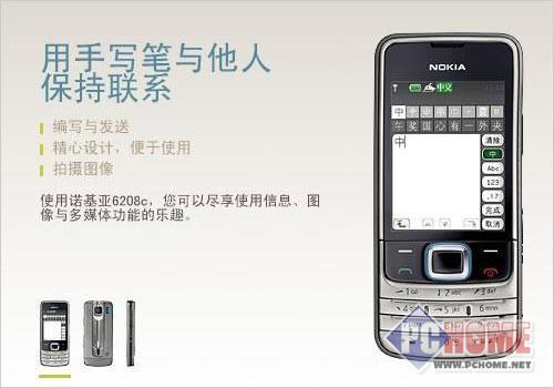 小编点评:诺基亚6208c的确是一款相当出色的机型,它有着优秀的操作体验和2.4英寸宽敞的屏幕,并且支持手写输入,3.5mm的耳机接口以及搭配了全面功能特性和简单操作的S40用户界面等等都是6208的优势所在,可以说6208很好的兼顾到了用户对实用性和时尚的要求,感兴趣的朋友不妨去看看。