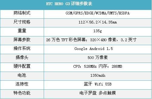 HTC G3采用Android操作系统,在硬件方面G3增进不少,其配备了高通MSM7200A的处理器,运行频率高达528MHz,配备了512MB的ROM以及288MB的RAM,运行速度方面自然丝毫不显迟缓。连接方面HTC Hero支持7.2M的HSDPA以及2M的HSUPA无线网络连接,配备了蓝牙2.0以及WIFI无线局域网的功能,而对于GPS的导航功能自然也是不会缺少。