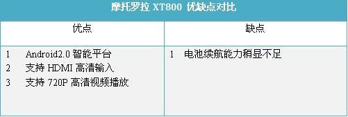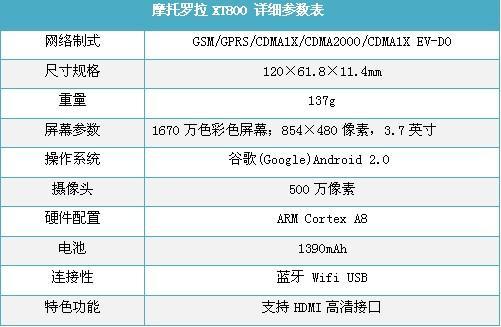 摩托罗拉XT800搭载了Android 2.0操作系统,采用的Cortex TM A8多核处理器,这样的配置确保了该机运行时的流畅 性,您无需担心画面迟滞这个问题。另外该机还融入了备受商务人士欢迎的双网双待功能,支持支持C/G双网同时在线, 使商务人士办公更轻松便捷。并且诸如蓝牙v2.1技术、音乐播放,3.5毫米耳机接口,WiFi无线上网,GPS导航以及存 储卡扩展等当前手机流行的功能应该是一应俱全。