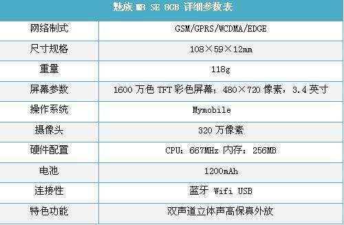 魅族M8se采用了667MHz主频的处理器,256MB内存,并有8GB/16GB两种存储器大小的版本规格,方便用户存储大量视频音频文件,娱乐功能强大。M8搭载了Win CE内核和由魅族公司自己开发的Mmobile用户UI系统,界面相当的精致,搭配多点触控功能。除此之外魅族M8配置了一枚320万像素摄像头,拍照效果一般。