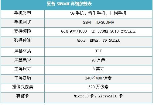 作为品牌下首款TD手机,夏普SH800M并没有采用过于高端的定位,从这款手机的配置来看,夏普SH800M采用了一块3英寸的液晶显示屏,分辨率为240×400像素,使用了入门级别的320万像素手机摄像头。此外,这款手机还内置GPS全球卫星定位系统,支持蓝牙等功能。