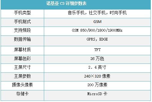 配置方面,诺基亚C3采用了2.4英寸QVGA屏幕,内置200万像素摄像头,支持FM收音机,具有3.5毫米耳机接口,机身拥有55MB内存并且支持通过microSD卡扩展到8GB。遗憾的是,诺基亚C3并不是一款3G手机,仅支持GPRS/EDGE网络。