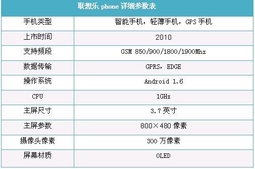 该机配备了3.7英寸的大触摸屏,采用了1GHz的高通的Snapdragon平台,Android 1.6操作系统,并拥有联想自己的UI界面,支持联通WCDMA网络。而且分辨率达到了目前顶级的800×480,内置300万像素摄像头以及3.5mm耳机插口。除此之外,联想乐phone还支持手机与PC同步,带有Wi-Fi无线上网功能。可见联想在乐phone身上还是下了不少功夫的。