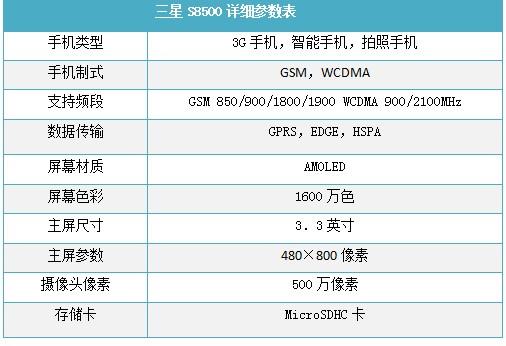 三星S8500的名字叫做Wave,这款手机采用1GHz的处理器,内置500万像素的摄像头并支持自动对焦和视频拍摄,但可能同样具备拍摄720p高清视频的能力。同时这款手机配备了3.3英寸的电容式触控屏幕,材质为AMOLED的玻璃屏幕。这款手机尽管采用Bada系统,但是同样采用了目前最新的TouchWiz 3.0。三星S8500这款手机带有2GB的内置存储空间,同时还能支持microSD卡拓展存储。这款手机尽管只有10.9毫米厚并采用了全铝机身,但是支持Wi-Fi(802.11 b/g/n)和WCDMA制式的3G网络,并配有3.5毫米耳机插孔。