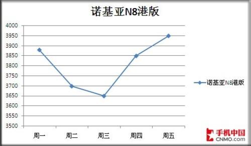 在近期刚刚登场不久的诺基亚N8(参数 报价 图片 论坛 软件)也是市场的一大看点,该机携带的最新Symbian^3智能操作系统和1200万像 素摄像头,都让诺基亚粉丝们为之疯狂。但在本周相比行货更具购买力的港版价格却大幅度反弹,通过价格走势图我们可以看出,周一至周三还处于下降趋势的诺基 亚N8港版,却在周末大涨,涨幅达到了300元。