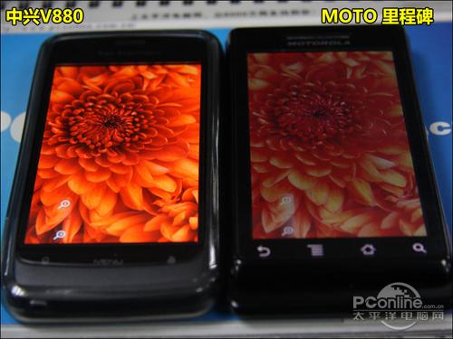 可视角度方面,中兴V880(左)的AMOLED屏完胜里程碑(右)