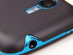 摩托罗拉XT502采用直板触屏造型设计,外形秀气圆润,机身尺寸115.8×60×13.7mm。正面90%黑色主体四周饰以亮蓝色金属圈,这种整体包裹式设计如神来之笔使得XT502动感十足且时尚俏皮。机身背板为塑料材质外加磨砂涂层,不仅触摸手感良好,还具有很好的防滑防污作用,此外背板上的点缀也很简洁。