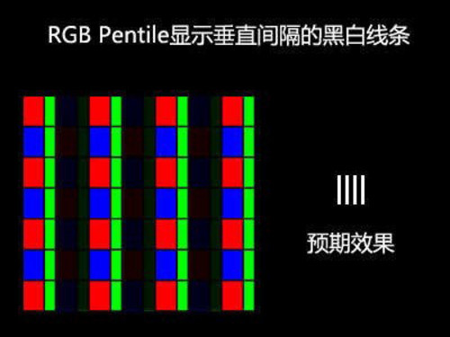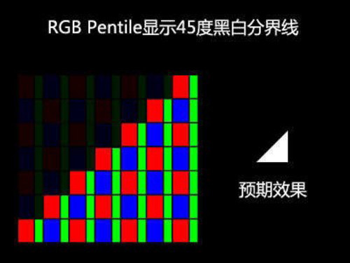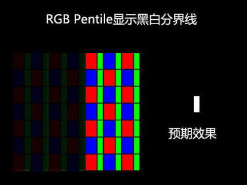 在这些情况下,会出现的问题都是屏幕上会出现非白色的边缘,这和我们要求的想去甚远,毕竟谁都不希望把黑白照片显示的花花绿绿吧?所以RGB PenTile技术会对这些情况作出一定的修正,那就是把一些本该熄灭的子像素点亮,人为的制造一些相邻像素,来实现颜色的正常显示。但这就带来了一个问 题,那就是本来平整的边缘变得不再平整,成为了锯齿状。这也是RGB PenTile之所以会出现边缘毛刺的原因。