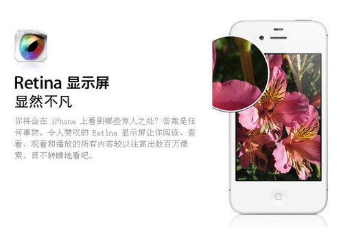 Retina屏幕是一种具备超高像素密度的液晶屏,它可以将960×640的分辨率压缩到一个3.5英寸的显示屏内。。也就是说,该屏幕的像素 密度达到326像素/英寸。对现实分辨率熟悉的用户会知道,通常我们电脑显示屏幕的分辨率为72像素/英寸。iPhone 4的分辨率为电脑的4倍多,甚至超过了人眼能分辨的范围。所以显示会非常细腻。电子书、网页和电子邮件中的文字以任何大小显示都清晰明锐,影片和照片中的 图像从任何角度观看都令人惊艳,所见一切都更清晰。