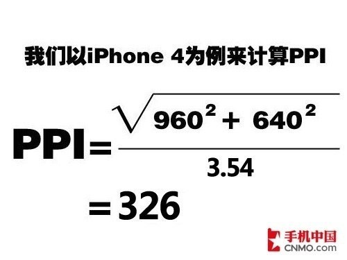 大家都知道,手机屏幕的细腻程度与屏幕的尺寸和分辨率有直接的关系,而评判屏幕细腻程度有一个专业的量词——PPI,PPI数值越高,代表屏幕 越细腻。而iPhone 4达到了惊人的326PPI(326像素/英寸),超过了人言可识别的范围。屏幕PPI值是通过一个公式进行计算出来的,下面就是屏幕PPI计算公式,我 们以iPhone 4为例。