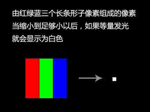 我们知道白色的光线是由红到紫的连续光谱组成的,而在计算机图形学里,则采用红绿蓝也就是RGB三种颜色的视觉等亮度混合(注意,不是光学等强 度)来调和出白色光。我们知道显示屏是由许许多多的像素构成的,而为了让每一个单独的像素可以显示出各种颜色,就需要把它分解为红绿蓝三个比像素更低一级 的子像素。也就是说,3个子像素构成一个整体,即彩色像素。当需要显示不同颜色的时候,三个子像素分别以不同的亮度发光,由于子像素的尺寸非常小,在视觉 上就会混合成所需要的颜色。