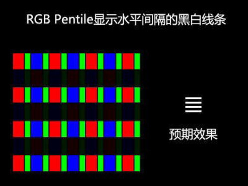 RGB PenTile为什么可以缩减1/3的子像素而保持总像素不变呢?既然缺少一种子像素,那它又是怎么达到依然显示3x3全彩色像素的结果的呢?这里面的关 键在于相邻像素之间的“共用子像素”。我们来看一下RGB PenTile在工作时的子像素点亮情况就知道了。首先我们模拟一下RGB PenTile显示水平间隔的白色线条。
