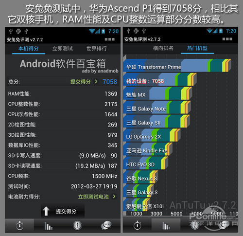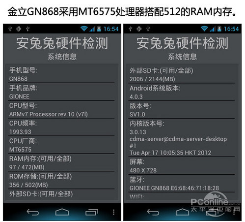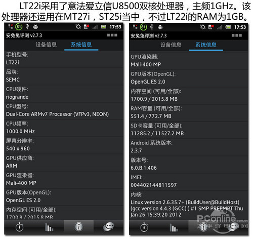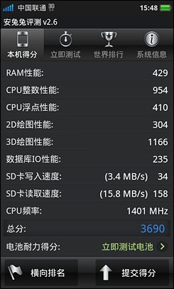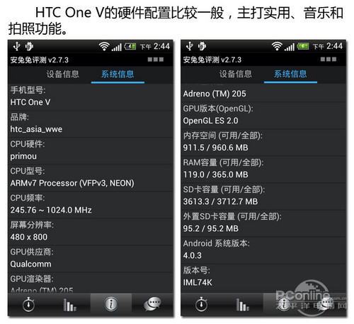 One V配备了主频为1GHz的MSM8255处理器,配合512MB内存,安兔兔测试得分只有2600分左右,可以流畅运行一些对硬件要求不高的应用程序。但四核已经问世、双核成为主流的今天,HTC One V的硬件配置有些落伍了。