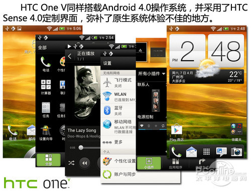 和定位于高端市场的HTC One X不同,HTC One V立足于主打性价比的中低端智能手机市场。但同样搭载了最新的Android 4.0操作系统,辅以HTC Sense 4.0定制界面,具有环形解锁、纵向排列任务管理器、一屏16宫格菜单等设计元素,带来了Android平台上顶级的系统体验。
