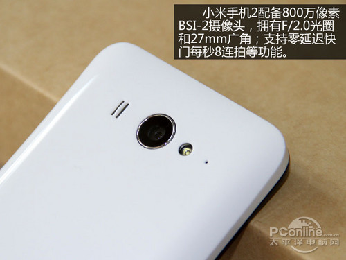 第一代小米手机显示效果一般,小米手机2相比之下有了明显的提升,高规格的屏幕功不可没。4.3英寸的可视面积在大屏手机当中并不突出,但分辨率符合720P高清标准,像素密度高达342ppi,符合视网膜屏幕标准,人眼几乎感觉不到颗粒感的存在。IPS触控屏幕材质符合主流规范,显示效果具有色彩还原准确、亮度充足、对比度高以及可视角度大的特点。小米手机2的拍摄性能达到四核手机主流水准,前置200万像素背照式CMOS摄像头在视频聊天中提供流畅的画面,而后置800万像素背照式CMOS摄像头拥有f2.0大光圈以及27mm超大广角,成像质量比较高,光线充裕的环境下所拍摄的影像噪点不明显。