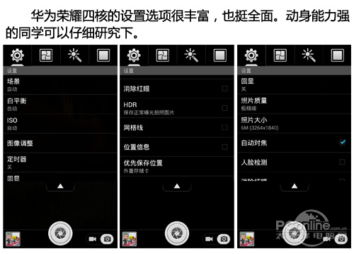 华为荣耀四核配备可视面积为4.5英寸的IPS屏幕,分辨率高达1280x720像素,像素密度为326ppi,符合视网膜屏幕的标准,正常观看距离下没有颗粒感,为用户呈现色彩鲜艳、画质细腻、可视角度大的显示效果,在视频、游戏等应用中有上佳的表现。华为荣耀四核不仅搭载用于自拍、视频聊天等应用的前置130万像素CMOS摄像头,而且拥有一颗800万像素背照式CMOS摄像头,内置双LED补光灯,支持拍摄模式选择、特效、滤镜等多种拍摄功能,成像质量较高,微距拍摄效果尤为突出。