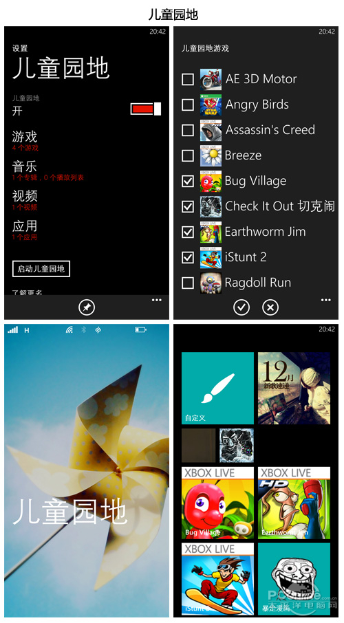 有人说Windows Phone8是开始迈向成熟的操作系统,起码这一更新,的确融入了许多个性化元素在里面。其中界面最大的改变就是可自定义动态磁贴尺寸和颜色,更能体现出Windows UI想把众多信息诠释在手机桌面的理念,短信草稿和群组聊天室的功能的支持,一定程度上革新了上一代操作系统的蹩脚体验。儿童乐园功能的加入,在禁止了拨号通话和发短信等功能之外,也体现出差异性的系统功能。
