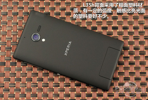 L35h的正面和L36h一样覆盖一层防爆膜,屏幕面板是防刮玻璃,但防爆膜则不防刮,所以爱惜手机的朋友最好再贴一层贴膜。在背部面板材质上,索尼 L35h显然要比L36h低上一个档次,采用的是工程塑料,有别于后者的玻璃材质。不过仿皮革纹理的设计显然是比较出彩的一点,既起到防滑作用,又能有效 抵御指纹侵袭。同时采用设计特色为“OmniBalance 全平衡设计”概念,设计重点在于创造平衡对称,确实L35h的握持感要比L36h好一些。